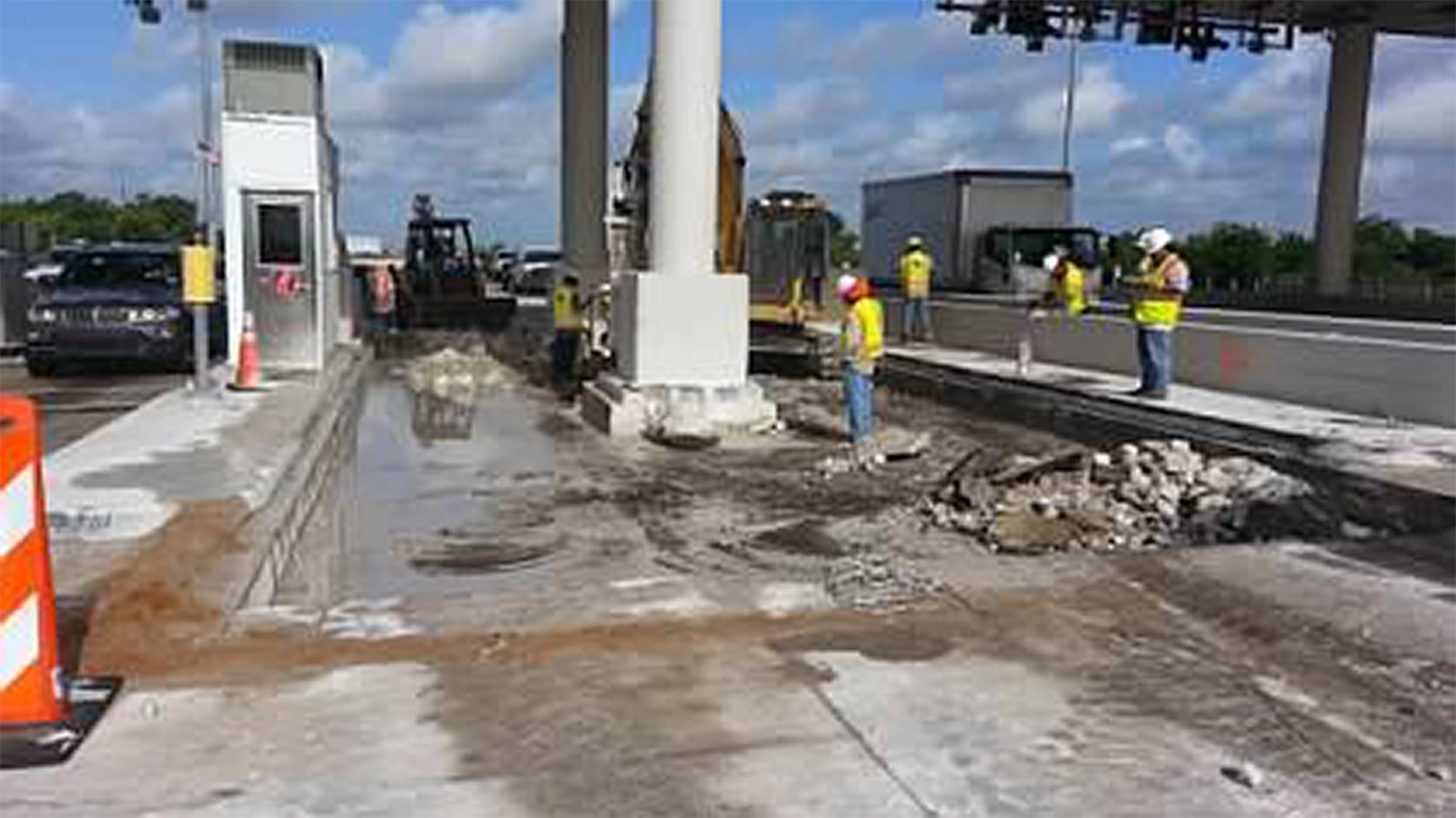 Full Depth Sawing & Lift Out is the method of removing a portion of a concrete slab by sawing the slab full depth, drilling holes and installing anchors in order to vertically lift the pavement out without damaging or undermining the remaining pavement.
